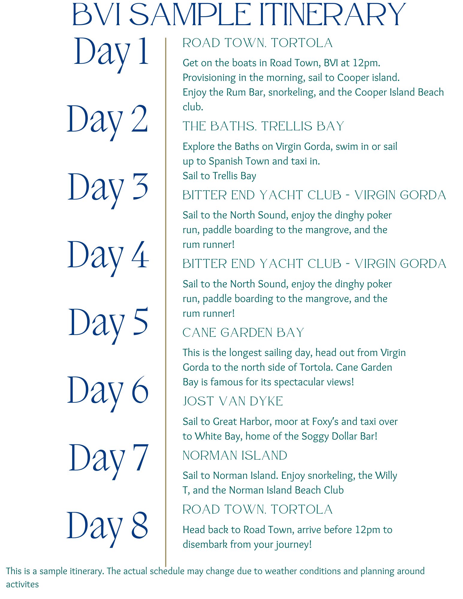 Spend eight days and seven nights exploring turquoise waters, sunny skies, and stunning destinations. We will set sail from Road Town, Tortola, and circle the island with stops at Norman Island, Cooper Island, Virgin Gorda, and Jost Van Dyke. Each day offers the chance to learn new sailing skills, snorkel, and see the amazing Islands. The British Virgin Islands is made up of more than 60 stunning islands and islets at the northern end of the Lesser Antilles in the Caribbean. With beautiful islands, a lively party atmosphere and genuine Caribbean welcome from locals, these islands are popular for good reason. Enjoy easy sailing with perfect weather in the BVI!